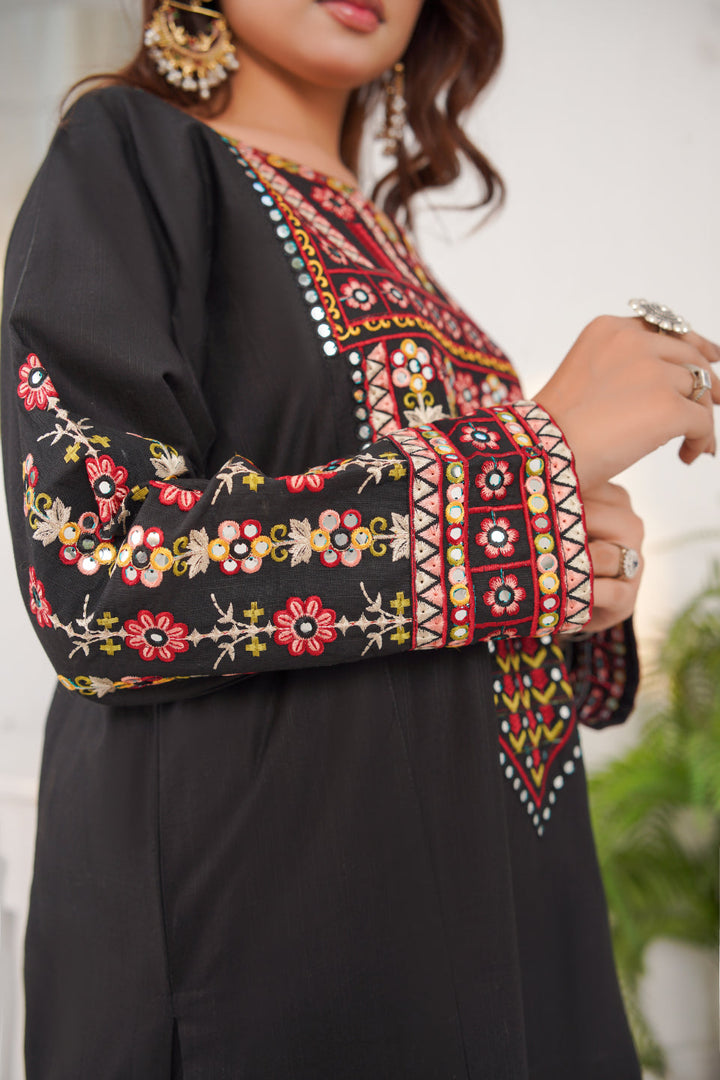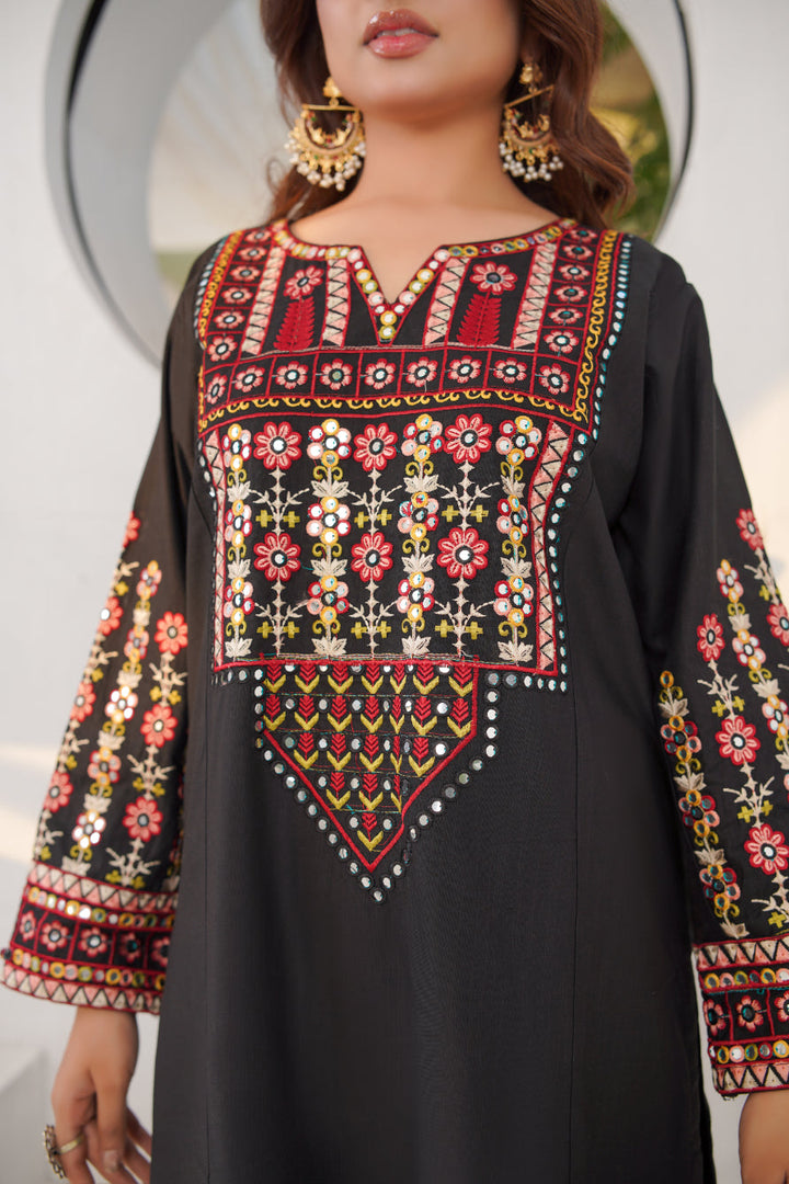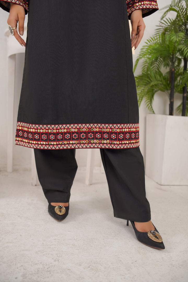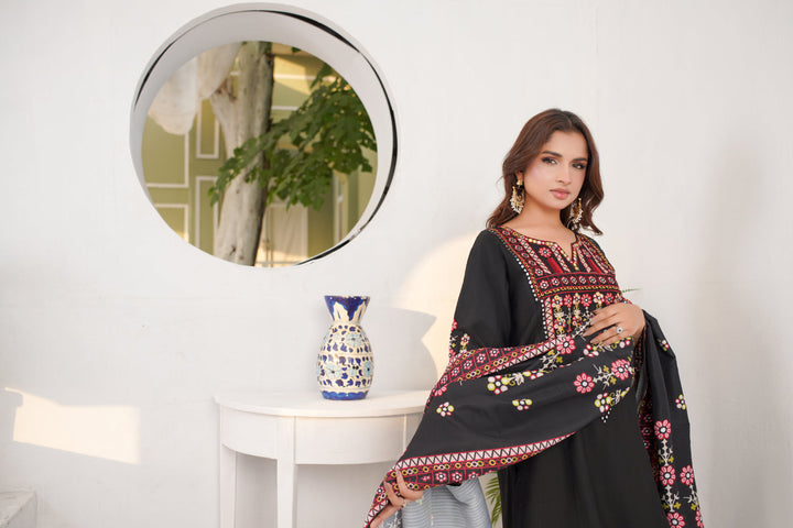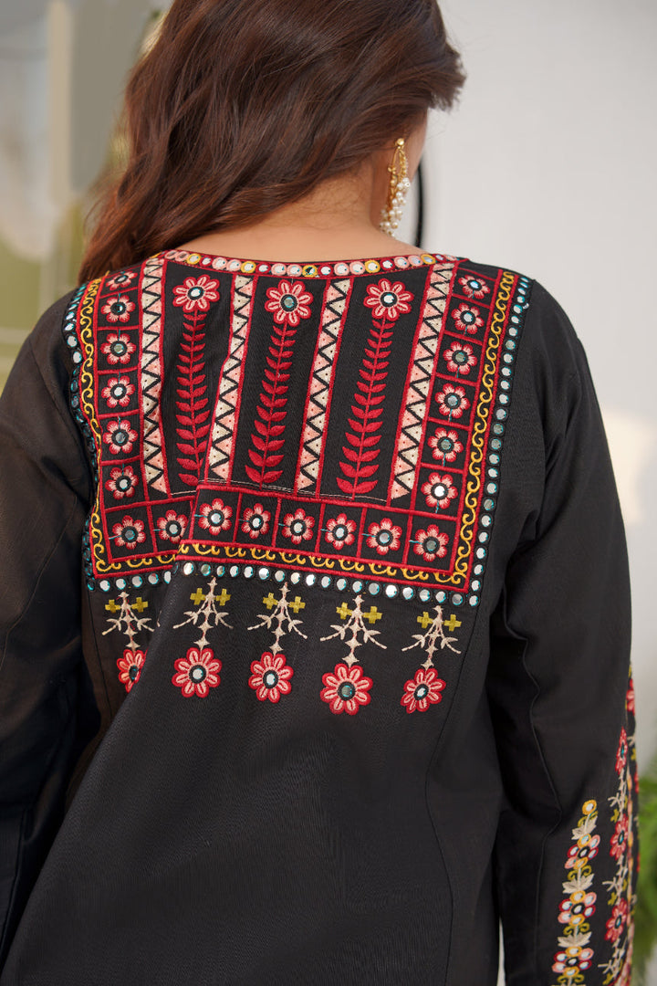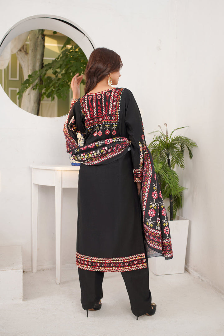 This 3-piece embroidered khaddar suit features intricate multicolor thread embroidery on a rich black canvas, creating a look that’s both royal and classy.